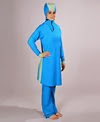 A cross between a burqa and a bikini, the polyester suit is made up of pants and a long- sleeved thigh or knee-length A-line top with head covering. It is water-repellent, UV-resistant and comes with Arab designs.